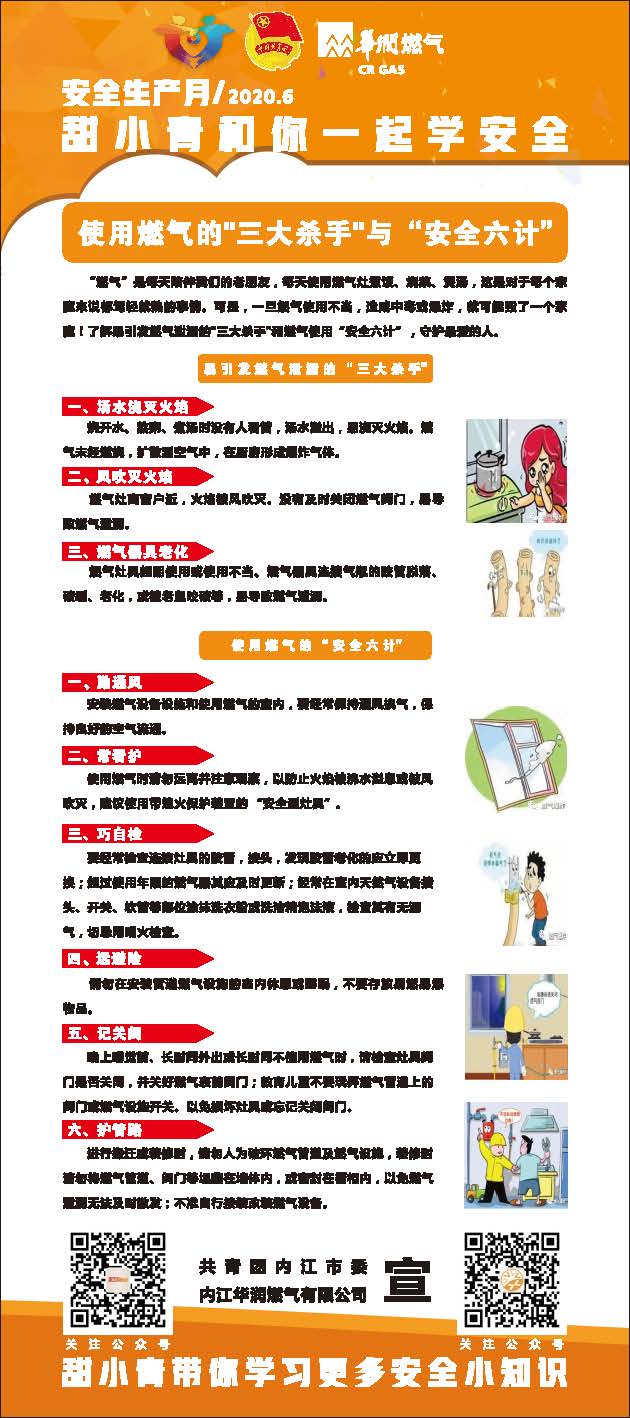 本次活動緊緊圍繞“甜小青和你一起學(xué)安全”展開,依靠共青團內(nèi)江的大平臺,通過團團明星“甜小青”的號召,華潤燃氣專業(yè)工作人員的講解,把燃氣使用安全知識通過安全視頻、公益課堂、宣傳海報等多種活潑、生動、有趣的便于小朋友接受的形式傳達給內(nèi)江的小朋友。并由小朋友將燃氣使用安全知識傳達到千家萬戶。