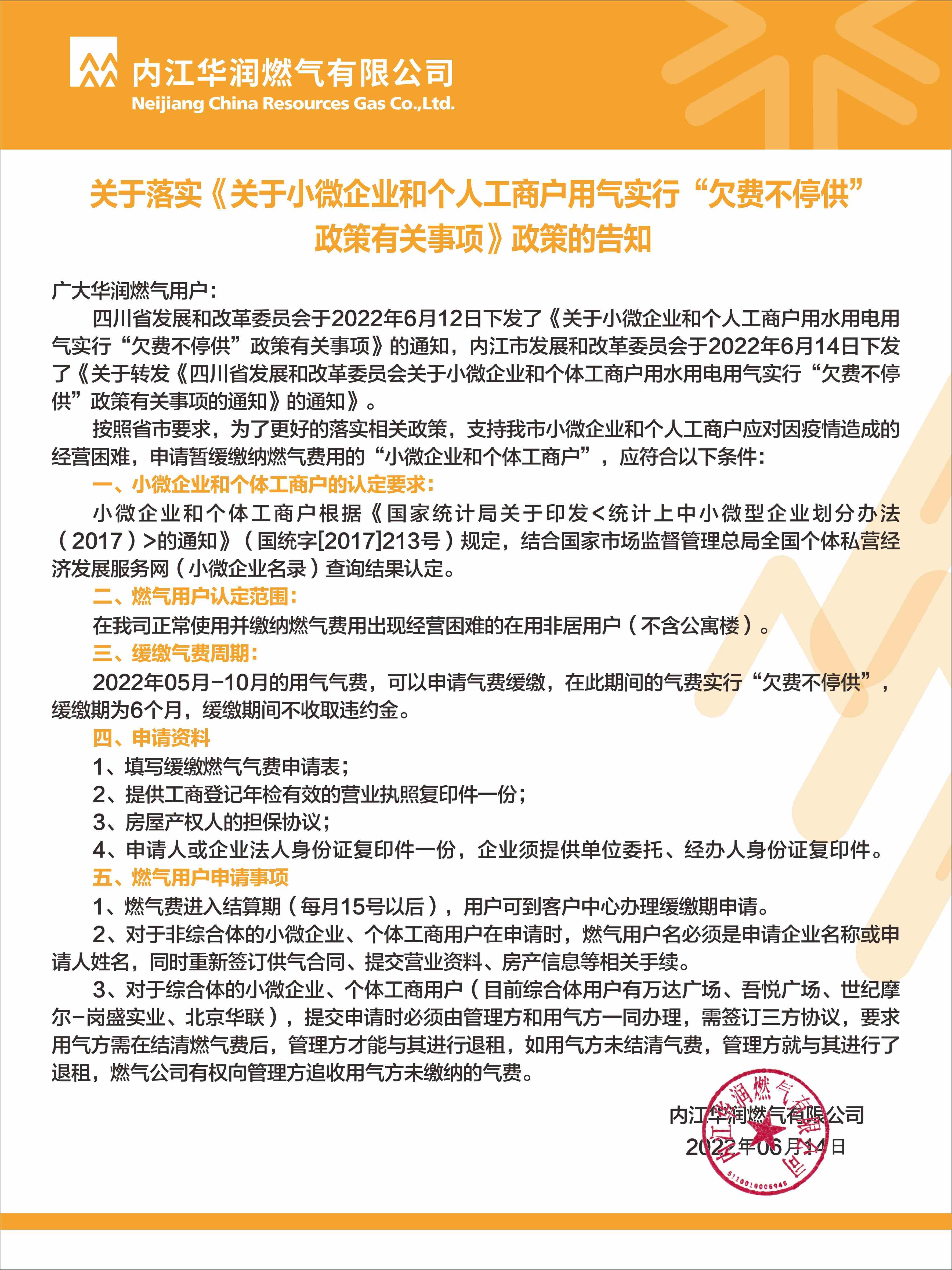 關于落實《關于小微企業(yè)和個人工商戶用氣實行“欠費不停供”政策有關事項》政策的告知