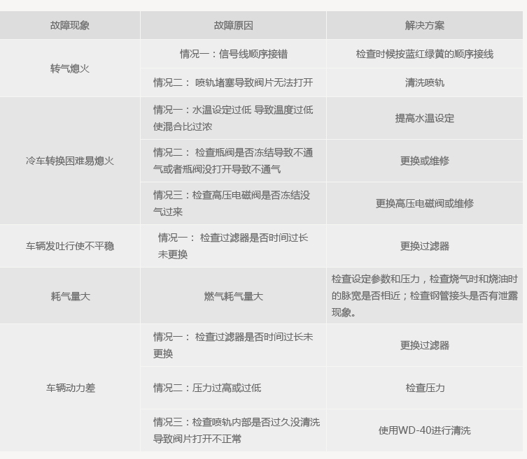 您可用礦泉水瓶自制肥皂液并隨車攜帶,以方便檢查漏點(diǎn);處理故障時如閥門被冰塊凍住,應(yīng)用溫水解凍后,方可操作,不要用錘或其他物件敲擊冰塊;嚴(yán)禁用水沖洗發(fā)動機(jī),當(dāng)車輛過積水路面時,應(yīng)減速慢過,以避免水濺到電器元件上,造成短路,損壞電控系統(tǒng);氣瓶在熄火后或行駛中閥體周邊出現(xiàn)結(jié)冰屬于正?,F(xiàn)象,如果發(fā)動機(jī)長時間不工作而閥體周邊出現(xiàn)結(jié)冰,說明閥體出現(xiàn)泄漏,應(yīng)即時處理。